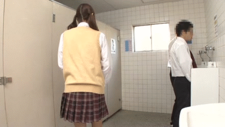 女子トイレが清掃中で漏れそう…女子高生が男子トイレで立ちション!男子生徒に見られまくりの暴走セックスGIF画像