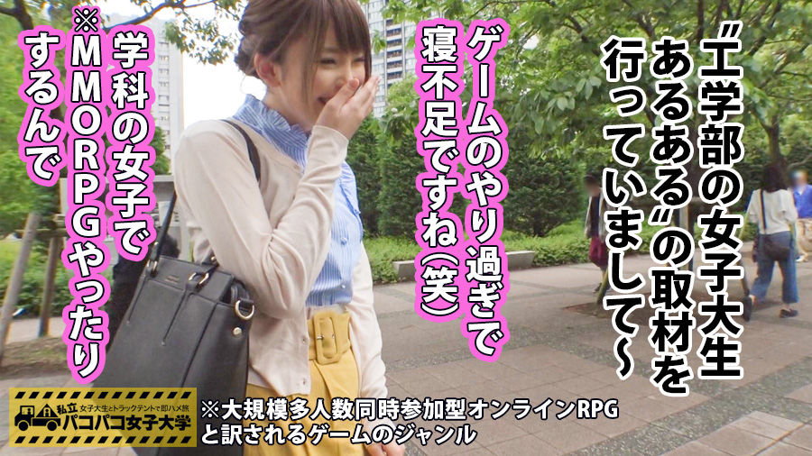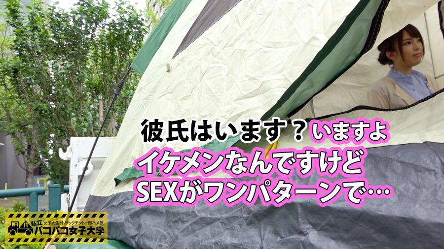 移動式テントで各大学を回り「性の悩みを聞く深夜番組」のテイでイマドキ女子大生に近づきセックスを撮影する企画です!S大学建築学部3年生の、のあちゃん。スバリ!性の悩みについて聞いてみると、”彼氏のセックスがワンパターンでつまらない”ことでお悩みなんだとか。乳首をこねくり回してキスをすればうっとりとした表情へ変わり、エッチモードに突入!おまんこを愛撫すればエッチな声が漏れ出します♪しっとりと潤ったソコにチ○コを挿入!ピストンすればジュプジュプと卑猥な水音がテント内に響き渡ります!喘ぎ声が大きいのあちゃんのお口にパンティーを突っ込み下からガンガン突きあげちゃいます♪フィニッシュはお口に濃厚ザーメンを発射!!