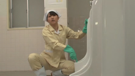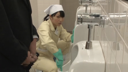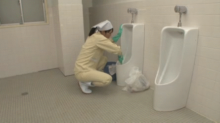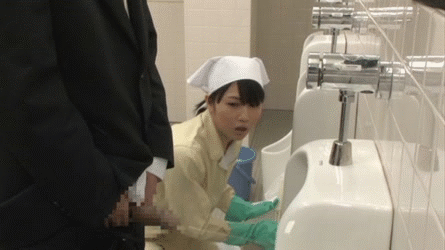 男子トイレを清掃中のおばさんがチンポ見て欲情!?思わずしゃぶりつく痴女セックスGIF画像